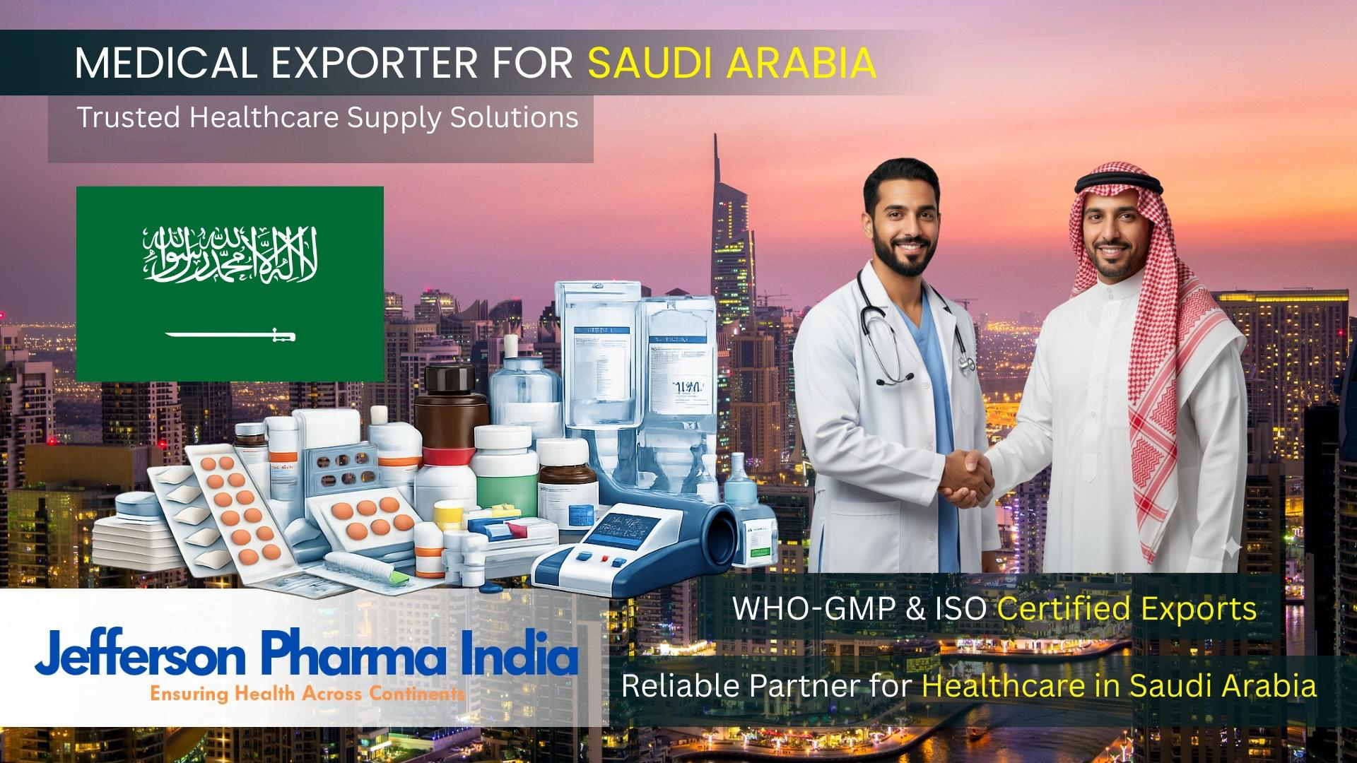 Jefferson Pharma India is a trusted exporter of pharmaceutical and medical products to Saudi Arabia, supporting hospitals, clinics, distributors, and humanitarian organizations across the Kingdom.
